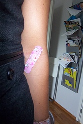 Allt lugnt med blodgivning, snyggt och fräscht där. Man får kaffe, saft, smörgås och kaka när man ska ge blod (allt för att inte svimma efteråt) så det kändes väldans hemtrevligt. Var dock tvungen att byta plåstret efteråt mot det mest fantastiska vackra som finns...