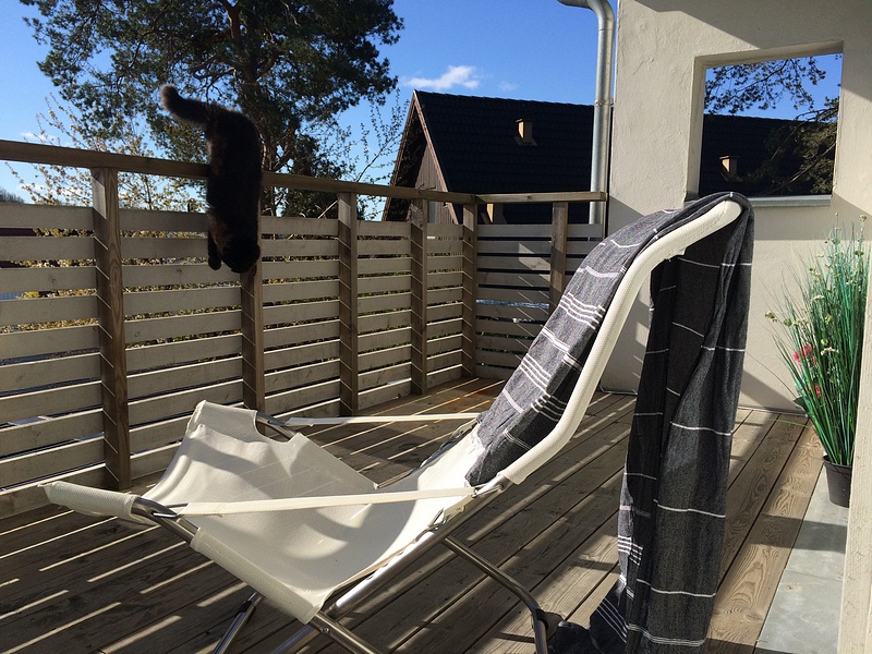 Underbart soligt väder har vi i dag och vår balkong är sååå varm och skön så här startar jag dagen nu. Inviger mitt nya hamam-badlakan som jag precis köpt, kommer användas flitigt i sommar=) Nu får jag skynda mig innan katten snor min stol;P