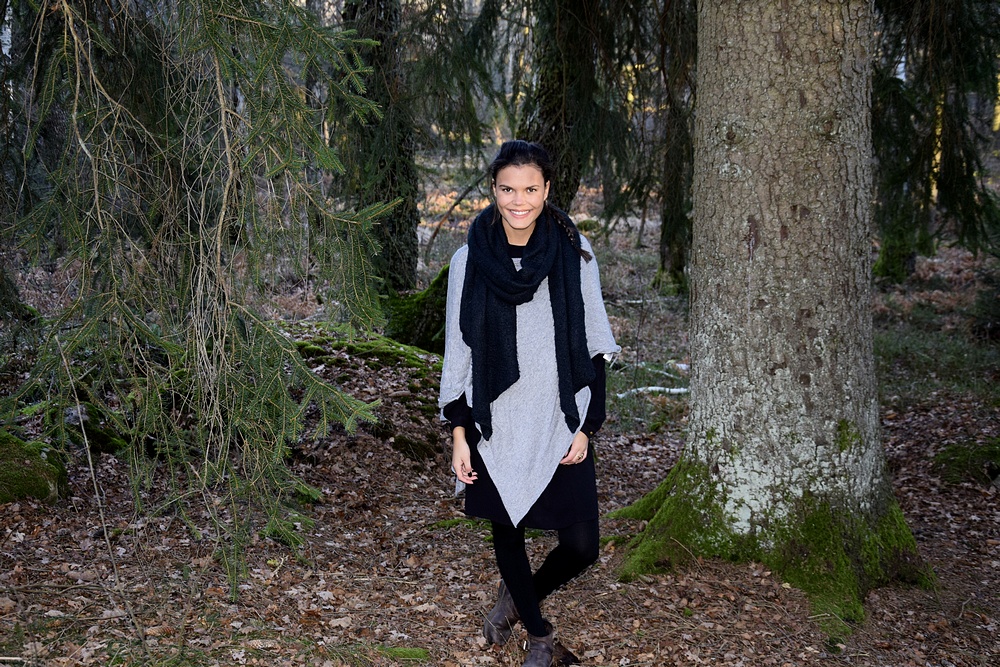 På promenaden klädde jag mig varmt med lite mandelkläder. Jag har på mig omtyckta klänningen "Vifroza" ihop med "pcrikki Poncho" och halsduken är "Pcpyron".